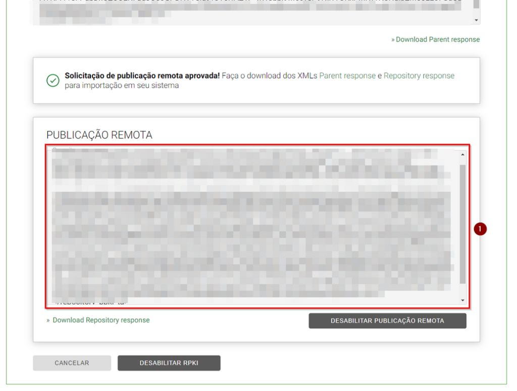 Como podemos ver abaixo, é só seguir o mesmo processo que fizemos com o Parents. Colamos o Publisher request na caixa de diálogo 1 e clicamos em 2 para habilitar a publicação remota.