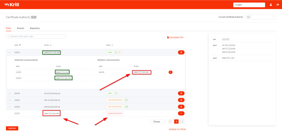 Quando você anuncia um prefixo fora do escopo da ROA você verá essa informação no seu krill. Abaixo uma tela de exemplo com um prefixo inválido IPv6 sendo anunciado. O escopo previa o anúncio de até um /48 mas o ISP acabou anunciando um /60.