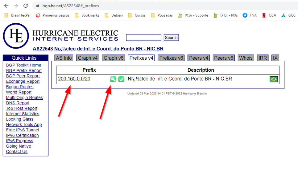 Nesse caso peguei o AS22548 do Nic.br. Repare que no prefixo abaixo tem uma chave verde do lado. Isso quer dizer que esse prefixo é válido e tem uma ROA para ele.