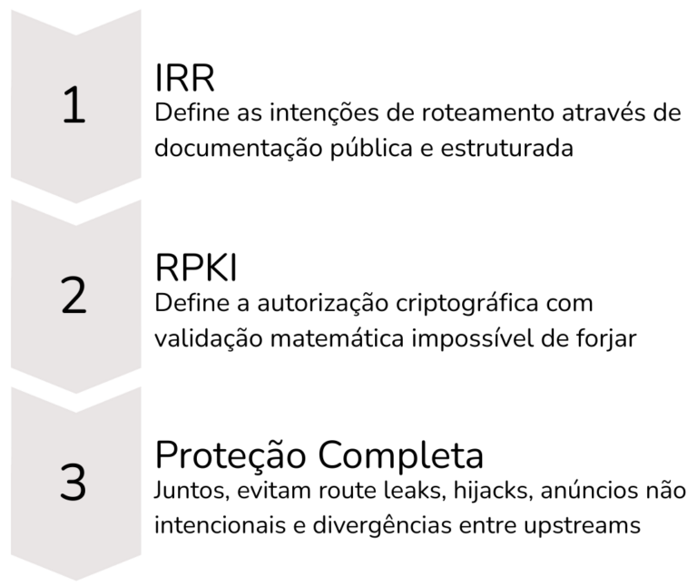Neste cenário real, IRR e RPKI trabalham juntos para garantir que o balanceamento de carga, as otimizações de roteamento e as políticas de communities sejam implementadas corretamente, sem risco de route leaks ou hijacks que comprometam a operação.