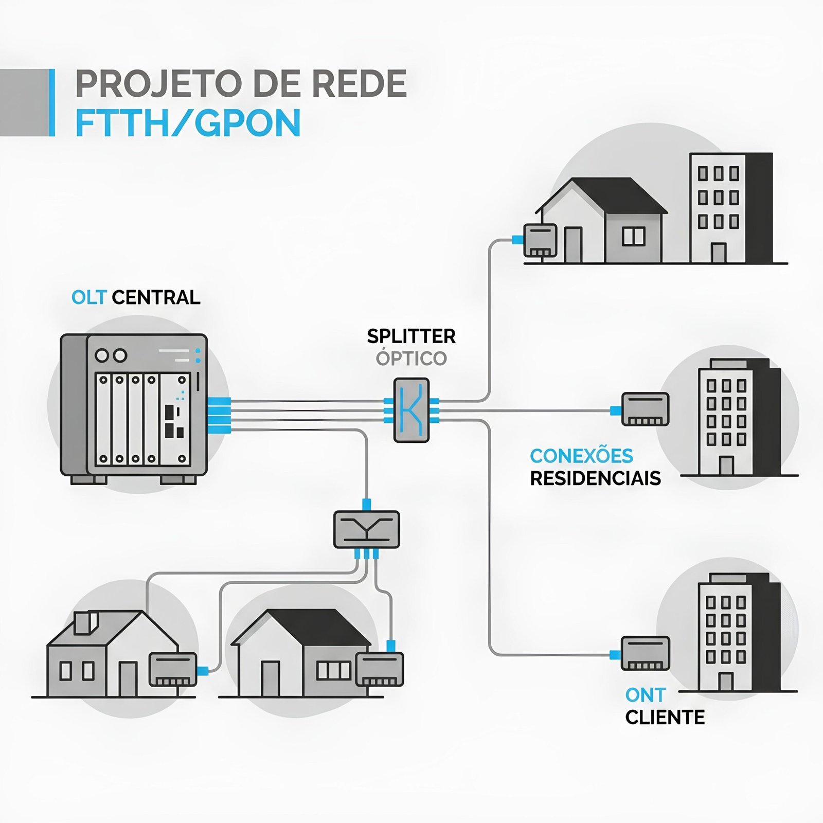 - Elaboração de projetos com definição estratégica de OLTs, CTOs e splitters.