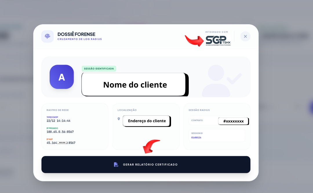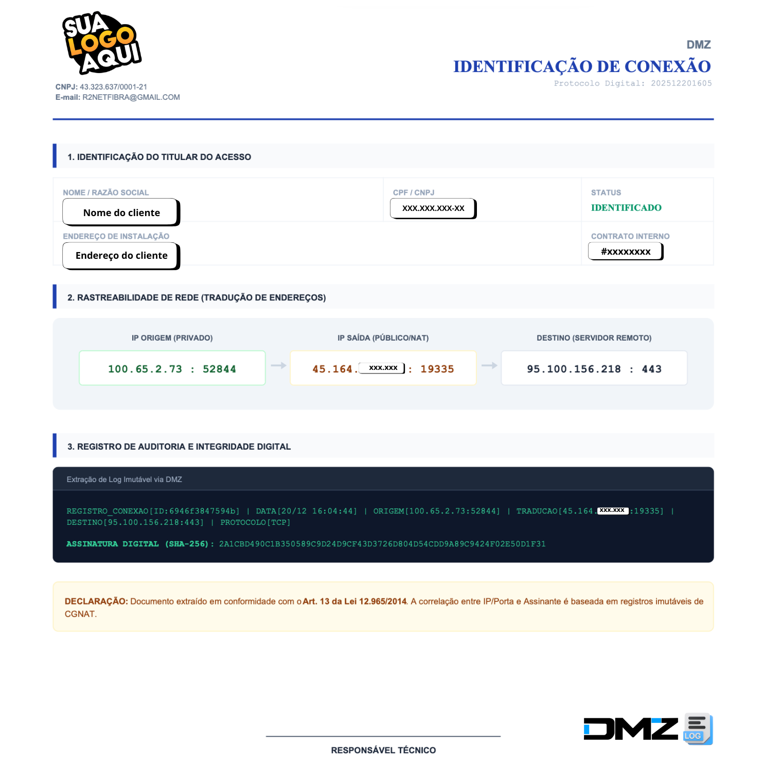 Nossa plataforma automatiza o processamento de logs de CGNAT, integra-se aos ERPs do provedor e gera relatórios jurídicos prontos para envio às autoridades, eliminando processos manuais, erros e dependência de técnicos.