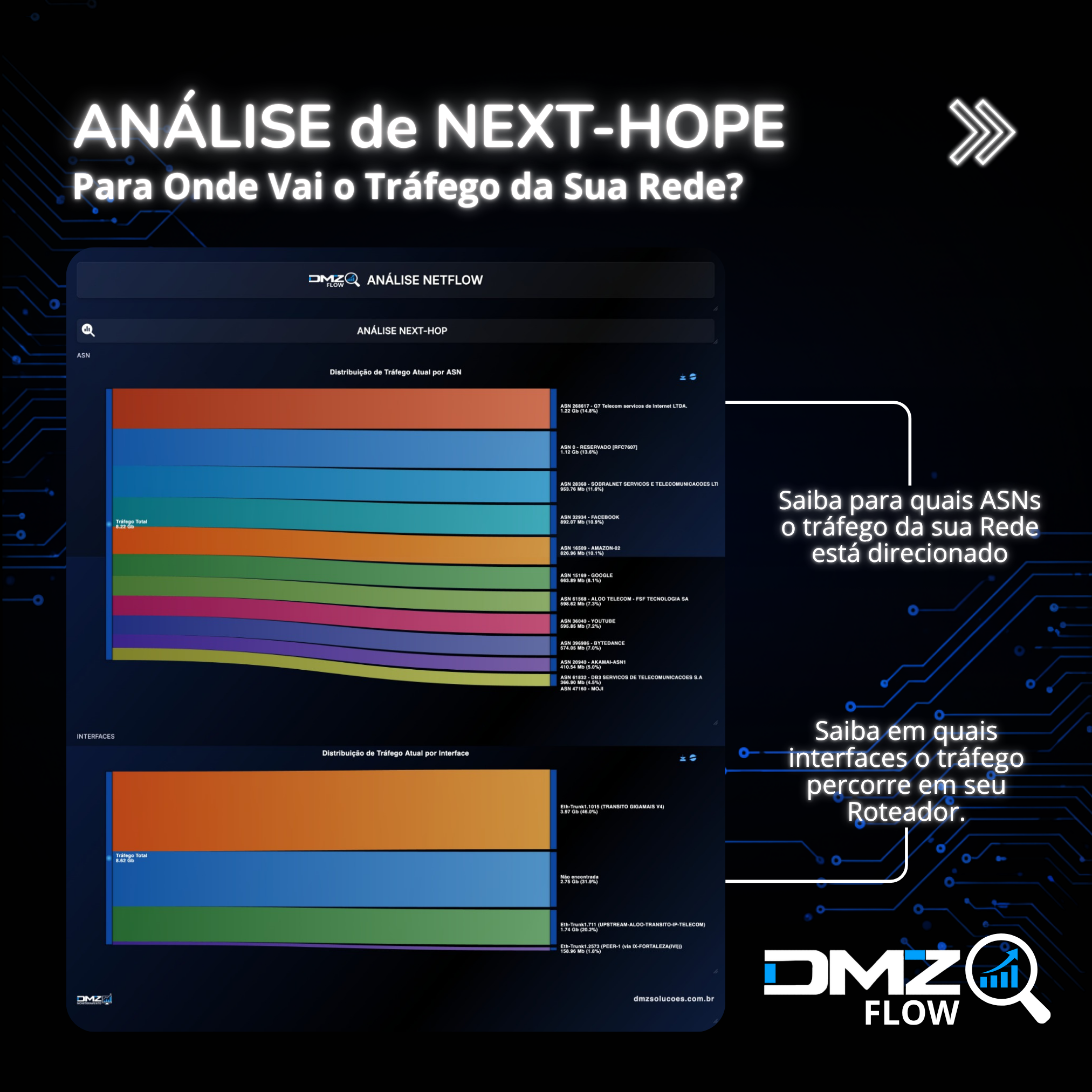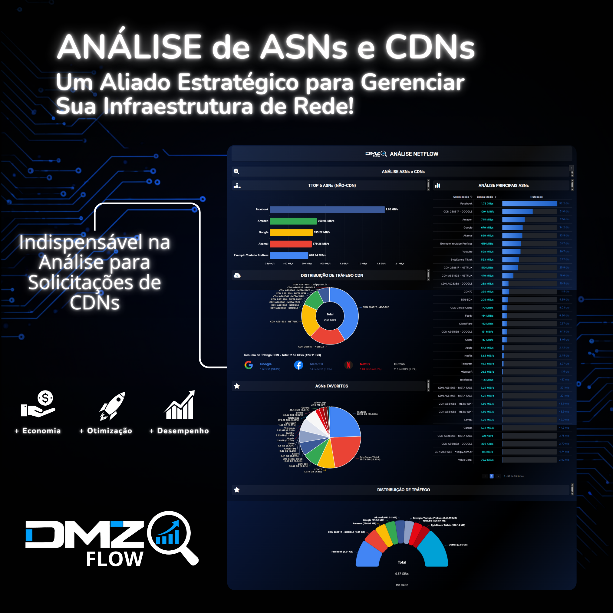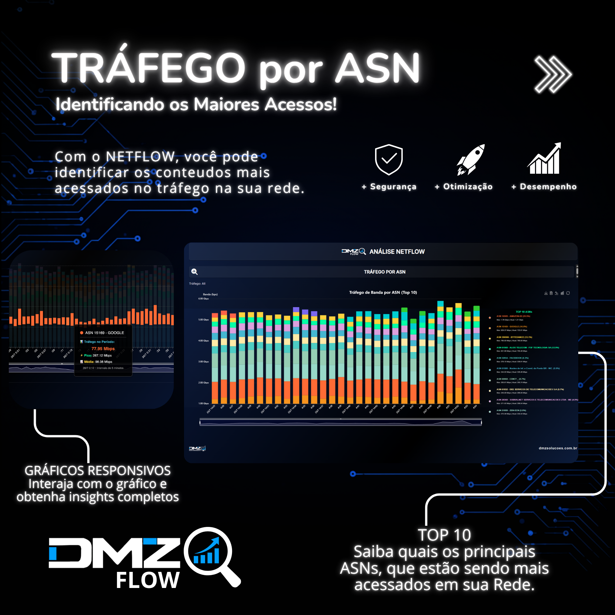 O DMZ Flow oferece uma visão completa do tráfego da sua rede, permitindo identificar gargalos, analisar comportamentos e planejar a capacidade de forma inteligente.