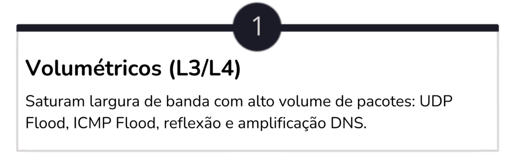 Estes ataques têm como objetivo principal saturar a largura de banda ou dispositivos de rede através de volumes massivos de pacotes,