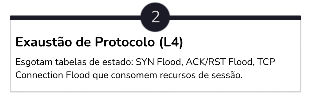 - Recursos de rede/protocolo: exaustão de tabelas de estado e filas de conexão