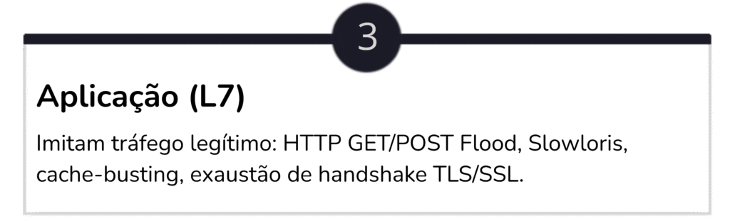 Os ataques DDoS podem ser categorizados de acordo com a camada do Modelo OSI que visam, cada uma exigindo estratégias de mitigação específicas: