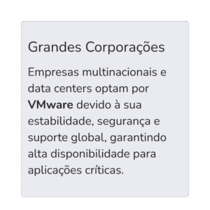 - VMware: Oferece recursos como vMotion (migração de VMs sem interrupção), DRS (distribuição dinâmica de recursos) e HA (alta disponibilidade), essenciais para ambientes corporativos que exigem uptime máximo.