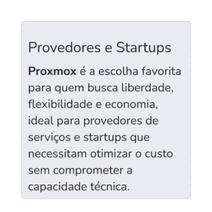 - Proxmox: Suporta clustering, migração ao vivo e backup integrado, além de ser flexível para integrar com soluções de armazenamento externas.