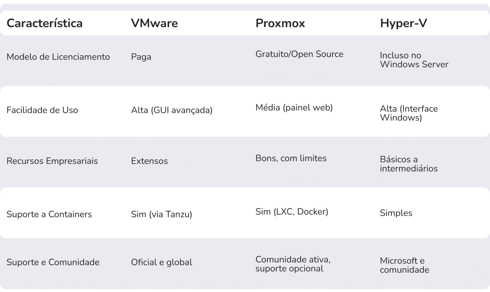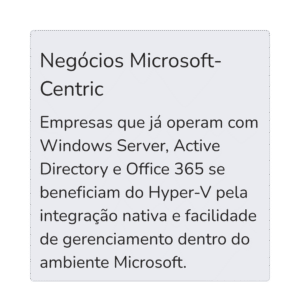 O Hyper-V se encaixa perfeitamente para quem já possui licenças de Windows Server, pois o custo da virtualização é praticamente zero. Isso o torna uma opção muito competitiva para ambientes que já operam no ecossistema Microsoft.